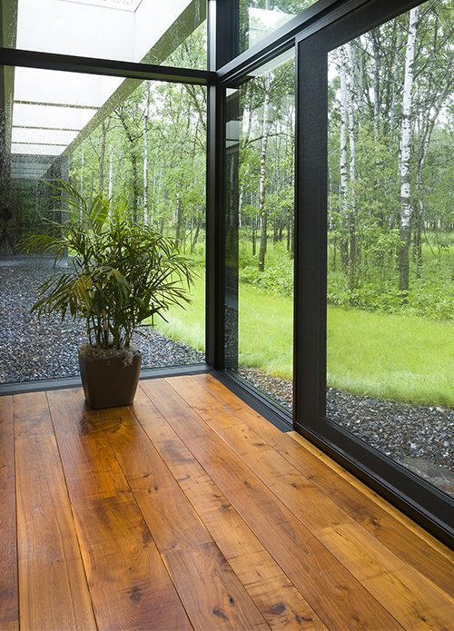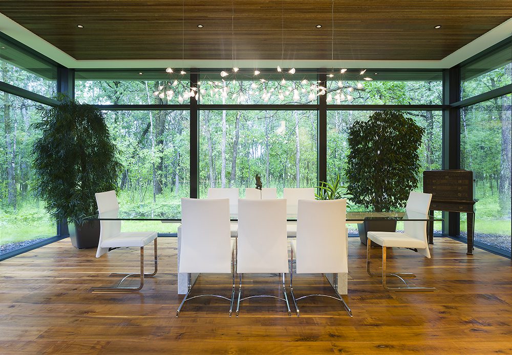 Secter Architecture + Design took it one step further, not only by bringing the exterior nature into the home’s interior but then every subsequent decision they made seemed to honor the great outdoors in even the most meticulous of details. Whether it was mimicking the serenity and tranquility of the forest, with a whisper-quiet furnace or quiet operation doors on their three-car garage, or incorporating natural elements, such as Carlisle Original Grade solid Walnut flooring and the branch like chandelier suspended over the dining room table, the boundary that divided outside from indoors became blurred.